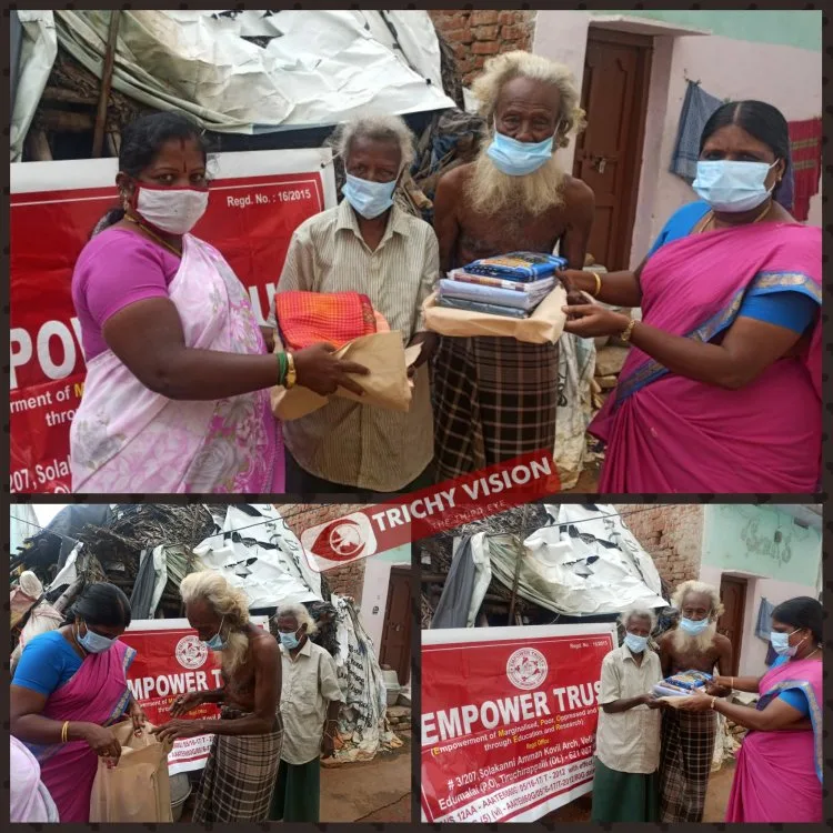 எம்பவர் டிரஸ்ட் திருச்சிராப்பள்ளியில் மிளகுபாறை குடிசைப் பகுதியில் வசிக்கும் முருகன் மற்றும் சந்தியா மேரி என்னும் தம்பதியினருக்கு நேற்றையதினம் கொரோனா நிவாரண பொருட்களாக புத்தாடைகள்( சேலை வேஷ்டி சட்டைகள் துண்டுகள்)ஆகியவற்றை எம்பவர் டிரஸ்ட் நிர்வாக இயக்குனர் முனைவர் கனிமொழி மற்றும் டிரஸ்ட் உறுப்பினர்சித்ரா நேரில் சென்று அவர்களைப் பார்த்து வழங்கியுள்ளனர்.