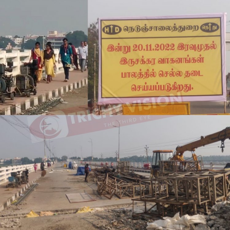 கடந்த செப்டம்பர் மாதம் முதல் காவிரி பாலத்தில் இரண்டு சக்கர வாகனங்கள் மட்டும் செல்ல அனுமதித்து காவிரி பாலத்தை சீரமைக்கும் பணி நடைபெற்று வந்தது பொதுமக்கள் சிரமத்தை குறைக்க மாவட்ட நிர்வாகம் இருசக்கர வாகனங்களை மட்டும் செல்ல அனுமதிருந்தது.இந்நிலையில் காவிரி பாலத்தை ஹைடிராலிக் ஜாக்கி மூலம் தூக்கி வைத்து பணிகள் மேற்கொள்ளப்பட உள்ளதால் (20.11.2022)முதல் இரவிலிருந்து முழுவதும் மூடப்படும் என மாவட்ட ஆட்சியர் பிரதீப் குமார் அறிவிப்பு வெளியிட்டார்.