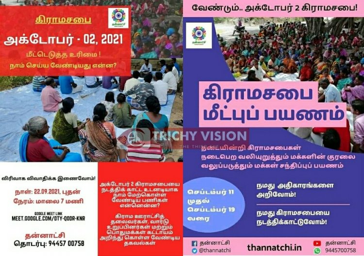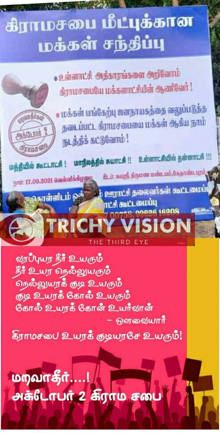 பின்னர் அதுவும் ரத்து செய்யப்பட்டது கிட்டத்தட்ட 20 மாதங்களுக்கு பிறகு வருகின்ற அக்டோபர் இரண்டாம் தேதி தான் கிராம சபை கூட்டம் நடைபெற இருக்கின்றது. கிராம சபை கூட்டம் என்பது மிக முக்கியமானது நம் இந்திய அளவில் முன்னேறுவதற்கு நாம் உள்ளூரில் முன்னேற்றம் மிக முக்கியமானது ஜனநாயக கடமை ஓட்டுப்போடுதல் என்பதை தாண்டி நம் உள்ளூர் பிரச்சனைகளை நாம் எடுத்துரைப்பது மிக முக்கிய பங்கு உள்ளது.