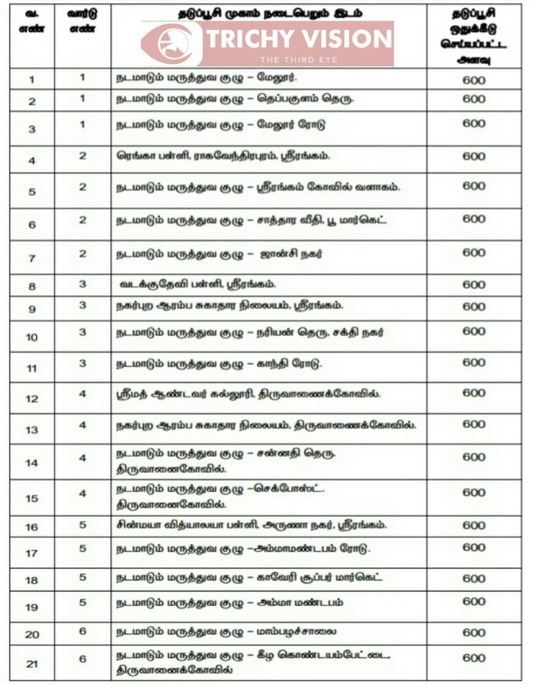 திருச்சிராப்பள்ளி மாநகராட்சியில் கொரோனா வைரஸ் தொற்று பரவலை தடுக்கும் பொருட்டு 18 வயதிற்கு மேற்பட்டோர் அனைவருக்கும் நாள்தோறும் சிறப்பு முகாம்கள் மூலம் கொரோனா தடுப்பூசி செலுத்தப்பட்டு வருகிறது. இந்நிலையில் தமிழகம் முழுவதும் நாளை (21.11.2021) அன்று மாபெரும் கொரோனா தடுப்பூசி முகாம்கள் நடத்த திட்டமிடப்பட்டுள்ளது. அதனை தொடர்ந்து திருச்சிராப்பள்ளி மாநகராட்சியில்