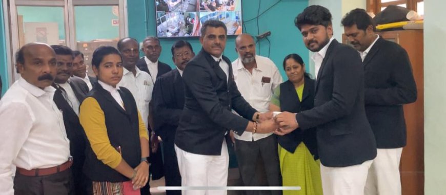 அருகில் நீதிமன்ற நடுவர்கள் சிவக்குமார், பாலாஜி, சுபாஷினி,மூத்த வழக்கறிஞர் மகேந்திரன், விக்ரமாதித்தன் மற்றும் பலர் உள்ளனர்.