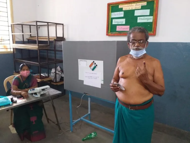 மத்திய மாநில அரசுகள் விவசாய விளைபொருட்களுக்கு போதிய விலை நிரந்தரம் செய்யாததாலும், வேளாண் சட்டங்களை திரும்பப் பெறக் கோரியும் தேசிய தென்னிந்திய நதிகள் இணைப்பு சங்கம் தலைவர் அய்யாக்கண்ணு உறையூர் தனலட்சுமி சீனிவாசன் பள்ளியில் மேல் சட்டை அணியாமல் பச்சை வேட்டியுடன் வாக்குச்சாவடிக்கு சென்று வாக்களித்தார்.