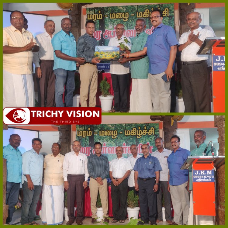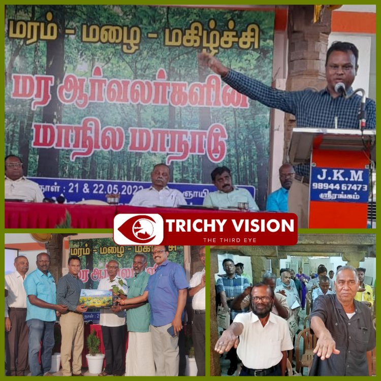 மர ஆர்வலர்களின் மரம் மழை மகிழ்ச்சி மாநில மாநாடு மற்றும் கருத்தரங்கு திருச்சி ஸ்ரீரங்கத்தில் இரண்டு நாட்கள் நடைபெறுகிறது. பசுமை சிகரம் கட்டளை விதைகள் யோகநாதன் தலைமை தாங்கினார். முதல் நாளான இன்று சாலையோர மரங்கள் வளர்ப்பு மக்களின் பங்கு அரிய வகை மரங்கள் மீட்டெடுப்பு காடுகள் மறுஉருவாக்கம் குறித்த தலைப்புகளில் மாவட்ட ஆட்சித் தலைவர்களும் இயக்குனர்களும் சிறப்புரையாற்றினர்கள்.