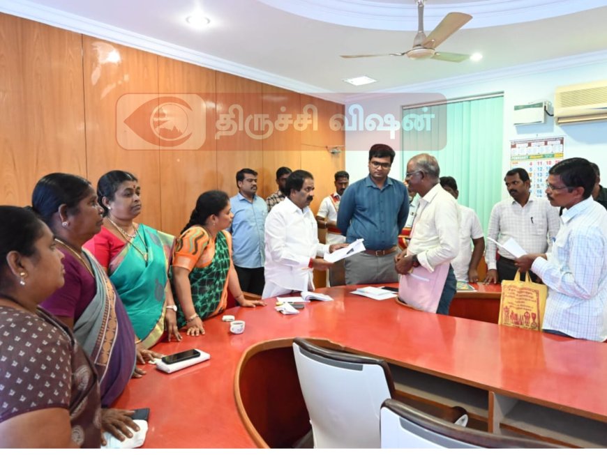 திருச்சிராப்பள்ளி மாநகராட்சி மேயர் அலுவலக கூட்ட அரங்கில்மேயர் மு. அன்பழகன் இன்று (19.02 2024) மாநகர பொதுமக்களிடம் கோரிக்கை மற்றும் குறைதீர்க்கும் மனுக்களை பெற்றார். அருகில் ஆணையர் வே.சரவணன்,