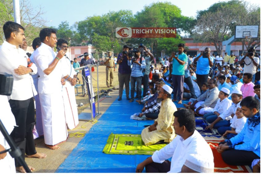 திருச்சியில் உள்ள அரசு சையது முர்துசா மேல்நிலைப்பள்ளி வளாகத்தில் கூடியிருந்த இஸ்லாமியர்களை இன்று (11.04.2024), தமிழக பள்ளிக்கல்வித்துறை அமைச்சர் அன்பில் மகேஷ் பொய்யாமொழி, மற்றும் திருச்சி நாடாளுமன்ற தொகுதி மதிமுக வேட்பாளர் துரை வைகோ நேரில் சந்தித்து ரமலான் வாழ்த்துகளை தெரிவித்தனர்.