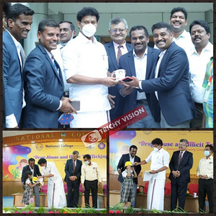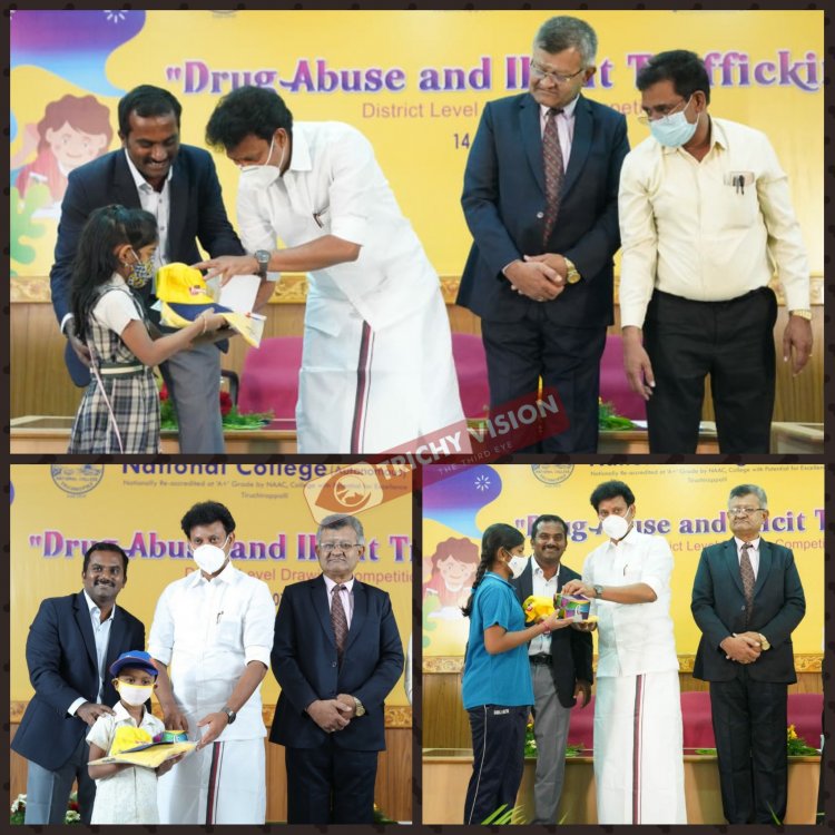 உலக போதை ஒழிப்பு தினத்தை முன்னிட்டு திருச்சி தேசிய கல்லூரி சார்பில் பள்ளி மாணவ மாணவிகளுக்கு ஆன்லைன் வாயிலாக ஓவியப் போட்டி நடத்தப்பட்டது அதில் வெற்றி பெற்ற மாணவ மாணவிகளுக்கு பரிசு வழங்கும் விழா திருச்சி தேசியக் கல்லூரியில் கல்லூரி கலையரங்கில் நடைபெற்றது. நாட்டுநலப்பணி திட்ட அலுவலர் மற்றும் துணை முதல்வரும் ஆகிய முனைவர் பிரசன்ன பாலாஜி வரவேற்புரை வழங்கினார்.