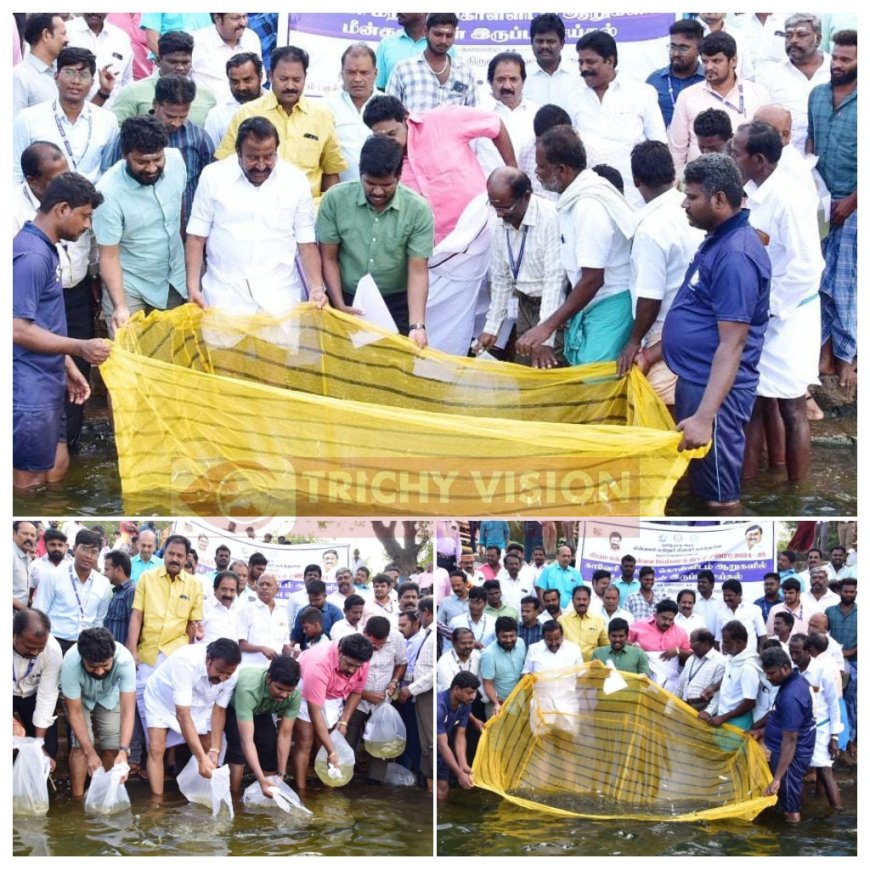 தமிழ்நாடு நகராட்சி நிருவாகத்துறை அமைச்சர் கே.என்.நேரு திருச்சி மாவட்டம், மண்ணச்சநல்லூர் வட்டம், முக்கொம்பு மேலணை காவிரி ஆற்றில் இன்று தமிழ்நாடு அரசு மீன்வளம் மற்றும் மீனவர் நலத்துறையின் வாயிலாக பிரதம மந்திரி மீன்வள மேம்பாட்டு திட்டத்தின் கீழ் 2024-25ம் ஆண்டிற்கு ஆறுகளில் நன்னீர் மீன்குஞ்சு பெருவிரலிகள் இருப்பு செய்தல் திட்டத்தில் திருச்சி மாவட்டத்தில் காவேரி மற்றும் கொள்ளிடம் ஆகிய ஆறுகளில் மொத்தம் 4.50 லட்சம் மீன்குஞ்சு பெருவிரலிகள் இருப்பு செய்யப்பட்டது.