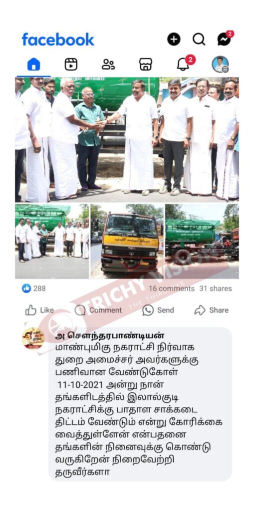இதில் லால்குடி எம்எல்ஏ சௌந்தர பாண்டியன்….. மாண்புமிகு நகராட்சி நிர்வாக துறை அமைச்சர் அவர்களுக்கு பணிவான வேண்டுகோள் 11-10-2021 அன்று நான் தங்களிடத்தில் இலால்குடி நகராட்சிக்கு பாதாள சாக்கடை திட்டம் வேண்டும் என்று கோரிக்கை வைத்துள்ளேன் என்பதனை தங்களின் நினைவுக்கு கொண்டு வருகிறேன் நிறைவேற்றி தருவீர்களா என்று பதிவிட்டு, மக்கள் பிரச்சினைகளை அமைச்சர் நேருவுக்கு நினைவூட்டி உள்ளார்.