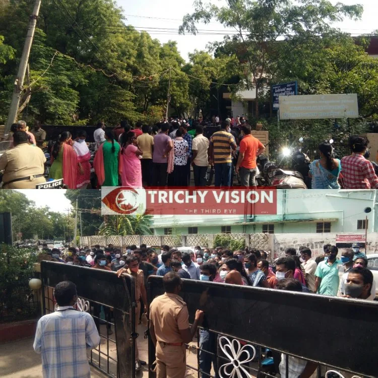 திருச்சியில் கோவாக்சின் தடுப்பூசி இரண்டாம் தவணை போட்டுக் கொள்வதற்காக அதிகநேரம் காத்திருக்கும் பொதுமக்கள்