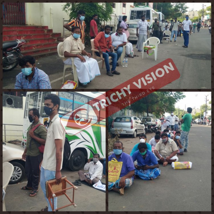 திருச்சி மாவட்ட ஆட்சியர் அலுவலகம் அருகே உள்ள இயன்முறை சிகிச்சை பயிற்சி கல்லூரியில் ரெம்டெசிவர் மருந்து வாங்க பொதுமக்கள் சாலையில் இரவு முழுவதும் காத்திருந்து தற்போது இருக்கைகளை போட்டு அமர்ந்து மருந்து வாங்க காத்திருக்கின்றனர்.