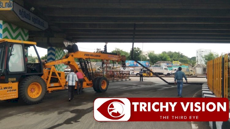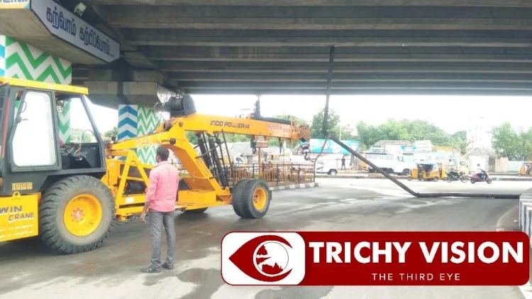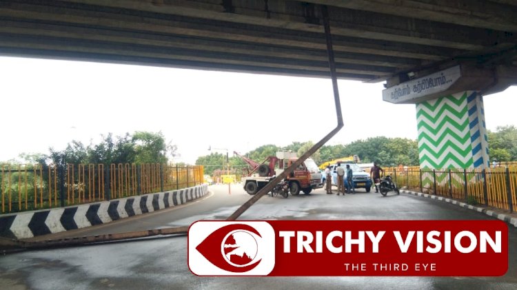 இது பற்றி தகவலறிந்து வந்து போக்குவரத்து போலீசார் அந்த வழியை தடுப்புகளை ஏற்படுத்தி வழியை அடைத்தனர். பின்னர் நெடுஞ்சாலை துறையினருக்கு தகவல் தெரிவிக்கப்பட்டு மேம்பாலத்திலிருந்து உடைந்து சாலையில் தொங்கி கொண்டிருந்த இரும்பு குழாயை அப்புறப்படுத்தினர்.
