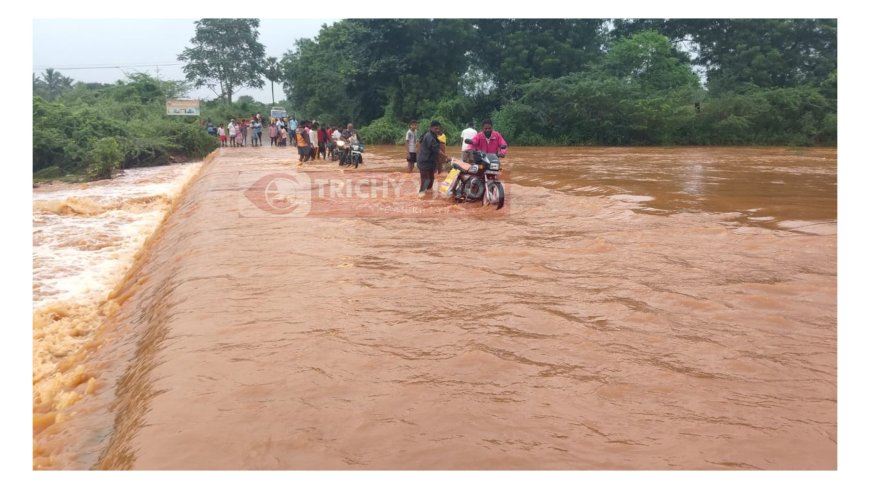 திருச்சி மாவட்டம், மணப்பாறையை அடுத்த வேங்கைகுறிச்சி செல்லும் சாலையின் குறுக்கே டொம்பச்சி ஆற்றில் தரைப்பாலம் கட்டப்பட்டுள்ளது. தொடர்மழையால் ஆற்றில் வெள்ளநீர் கரைபுரண்டோடும் நிலையில் தரைப்பாலத்தை மூழ்கடித்து சாலையின் மேல் பகுதியில் மழைநீர் பெருக்கெடுத்து ஓடுகிறது.