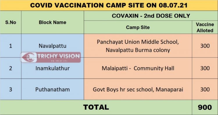 திருச்சி மாவட்டத்தில் நாளை(08.07.2021) கோவாக்சின் தடுப்பு ஊசிகள் போடப்படும் இடங்களை ஆட்சியர் சிவராசு அறிவித்துள்ளார்.