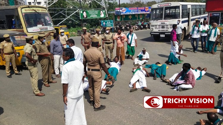 அனைவரும் எம் ஜி ஆர் சிலையிடம் மனு கொடுக்க முயற்சித்த நிலையில் காவல்துறை அனுமதிக்காததால் விவசாயிகள் சாலையில் படுத்து போராட்டத்தில் ஈடுபட்டனர்.