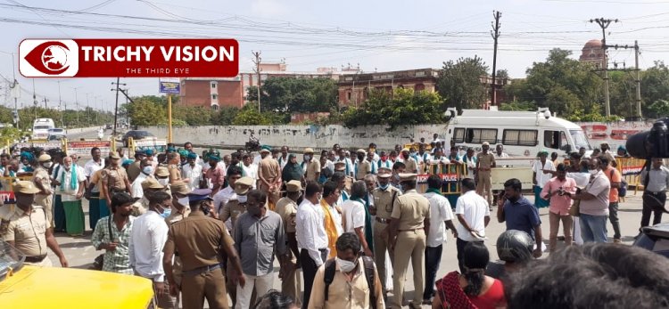 மத்திய அரசு கொண்டு வந்த புதிய வேளாண் சட்டங்களுக்கு உச்சநீதிமன்றம் தற்காலிக தடை விதித்திருக்கும் நிலையில், மத்திய அரசானது தாங்கள் கொண்டு வந்த வேளாண் சட்டத்தை திரும்பப் பெற முடியாது என்று தன்னுடைய உறுதியான நிலைப்பாட்டை தெரிவித்துள்ளது. இந்நிலையில் விவசாயிகள் டெல்லியில் டிராக்டர் அணி போராட்டத்தில் ஈடுபடவுள்ளதாக அறிவித்திருந்த நிலையில், தமிழக விவசாயிகளும் அவர்களுக்கு ஆதரவாக இங்கு தொடர்ந்து பல கட்ட போராட்டங்களில் ஈடுபட்டு வருகின்றனர். அதன் ஒரு பகுதியாக இன்று மத்திய அரசு கொண்டு வந்த வேளாண் சட்டங்களை திரும்பப் பெற வேண்டும் என்றும், இந்த கடந்த 15 நாட்களில் பெய்த கனமழையின் காரணமாக பாதிக்கப்பட்ட விவசாயிகளுக்கு ஏக்கருக்கு 30 ஆயிரம் ரூபாயும், மற்ற தானியங்களுக்கு ஏக்கருக்கு 20 ஆயிரம் ரூபாயும் வழங்க வேண்டும் உள்ளிட்ட பல்வேறு கோரிக்கைகளை வலியுறுத்தி தேசிய தென்னிந்திய நதிகள் இணைப்பு விவசாயிகள் சங்கத்தினர் திருச்சி நீதிமன்றம் அருகில் அமைந்துள்ள எம்.ஜி.ஆர் சிலையிடம் மனுவை அளித்தனர்.
