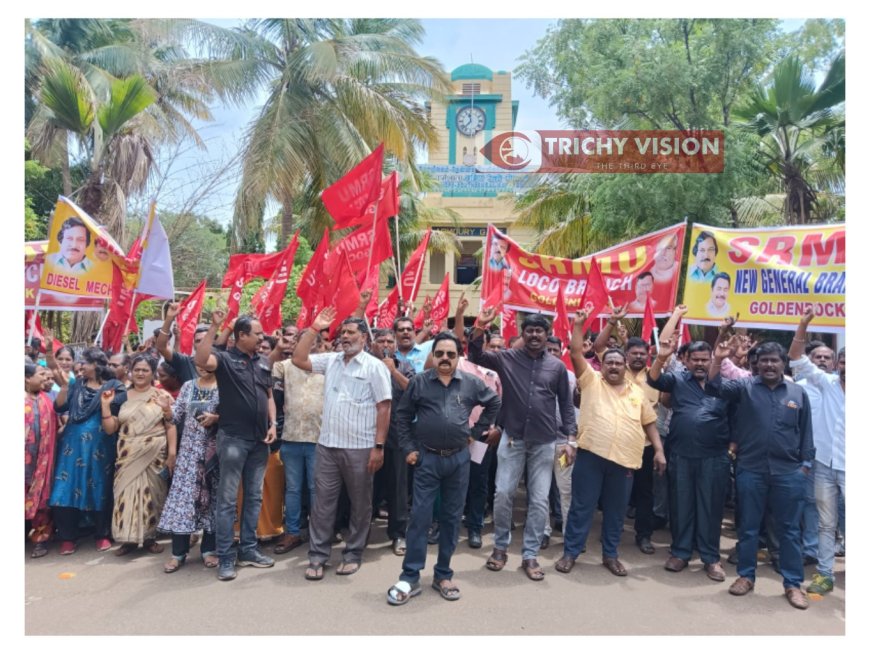 ரெயில்வே தொழிலாளர்களை ஒப்பந்த அடிப்படையில் பணியமர்த்த கூடாது, காலிப்பணியிடங்களை நிரப்ப வேண்டும் உள்ளிட்ட கோரிக்கைகளை வலியுறுத்தி எஸ்.ஆர்.எம்.யூ தொழிற்சங்கத்தினர் இன்று ஒரு நாள் ஆர்ப்பாட்டத்தில் ஈடுபட்டனர். அதன் ஒரு பகுதியாக திருச்சி பொன்மலை ரெயில்வே பணிமனை முன்பு எஸ்.ஆர்.எம்.யூ ரெயில்வே தொழிற்சங்கத்தினர் அச்சங்கத்தின் துணை பொதுச்செயலாளர் வீரசேகரன் தலைமையில் ஆர்ப்பாட்டத்தில் ஈடுபட்டனர்.