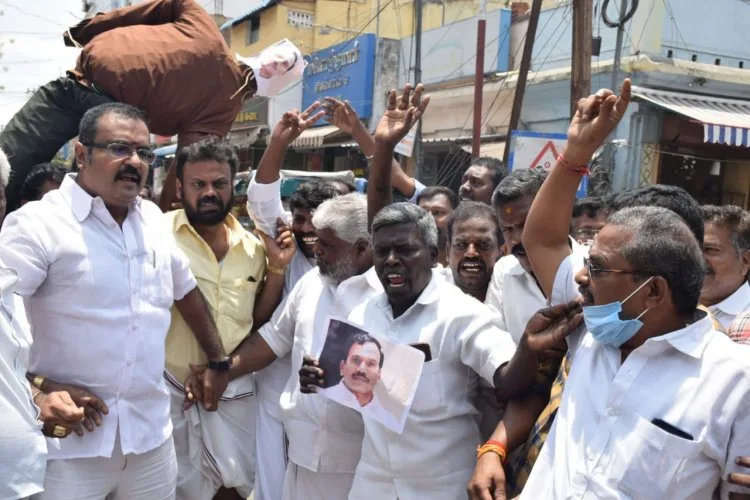 தேர்தல் பரப்புரையின் போது தமிழக முதல்வரின் தாயாரை இழிவாக பேசிய முன்னாள் மத்திய அமைச்சரும், திமுக துணை பொது செயலாளருமான ஆ.ராசாவை கண்டித்து தமிழகம் முழுவதும் அதிமுகவினர் ஆர்ப்பாட்டம் நடத்தி வருகின்றனர். இதன் ஒருபகுதியாக திருச்சி உறையூர் பஞ்சவர்ணசாமி கோவிலில் அருகில் அதிமுக உறையூர் பகுதி செயலாளர் பூபதி தலைமையில் அதிமுக தொண்டர்கள் ஆ.ராசாவின் உருவபொம்மையை எரிக்க முயன்றனர்.