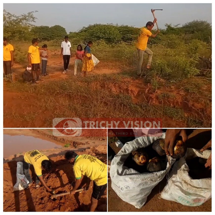 இதன் ஒரு பகுதியாக திருச்சி மாவட்டம் துவாக்குடி ரிங் ரோடு அருகே உள்ள எலந்தப்பட்டி குளக்கரையில் மண்ணும் மரமும் இயக்கம் சார்பில் ஆயிரம் பனை விதைகள் நடும் பணியானது இரண்டு நாட்களாக நடைபெற்றது.