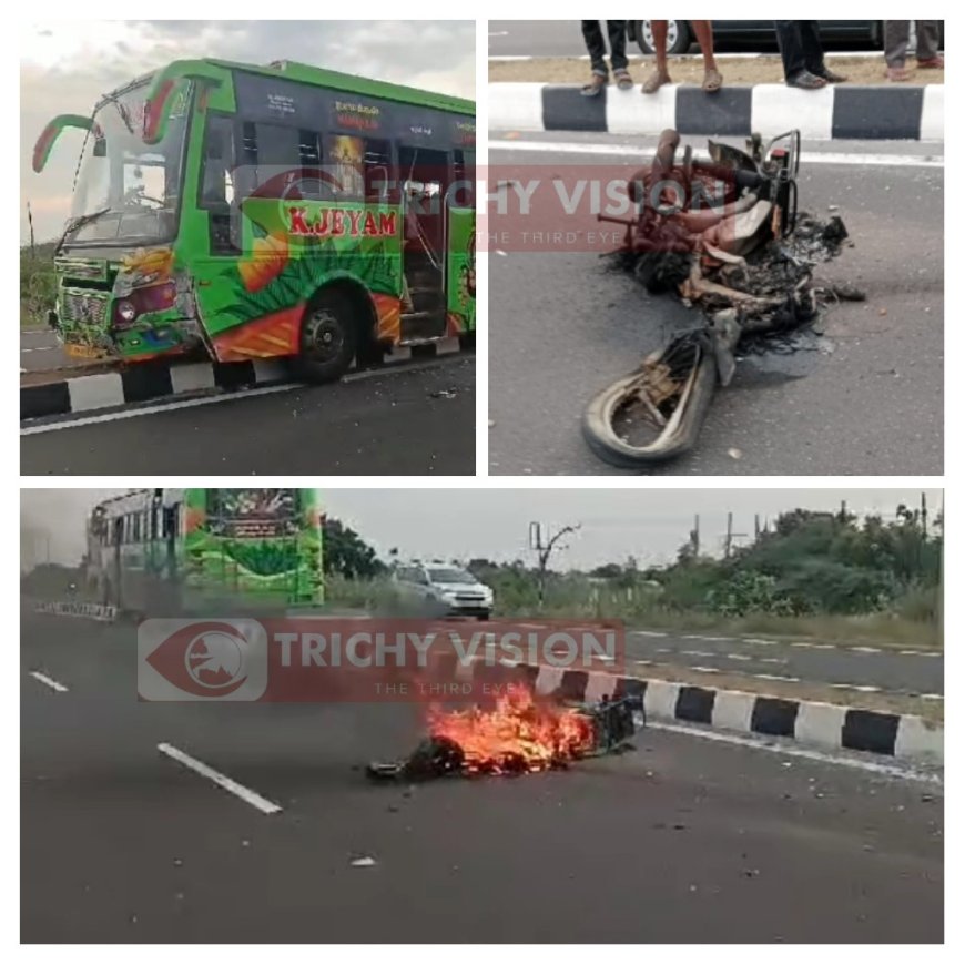 அப்போது திருச்சி – நாமக்கல் சாலையில் வாழவந்தி சத்திரம் என்ற இடத்தில் மெயின் ரோட்டில் வந்தபோது நாமக்கல்லில் இருந்து திருச்சி நோக்கி வந்த தனியார் பேருந்து இருசக்கர வாகனம் மீது மோதி இழுத்துச் சென்று தீப்பிடித்து எரிந்தது. விபத்தில் படுகாயம் அடைந்த முத்தாள் நாயுடு சம்பவ இடத்திலேயே பரிதாபமாக உயிரிழந்தார். பின்னால் அமர்ந்து வந்த தலம சாமி படுகாயங்களுடன் மீட்கப்பட்டு அப்பகுதியினர் உதவியுடன் நாமக்கல் தனியார் மருத்துவமனையில் சிகிச்சைக்கு சேர்க்கப்பட்டார்.