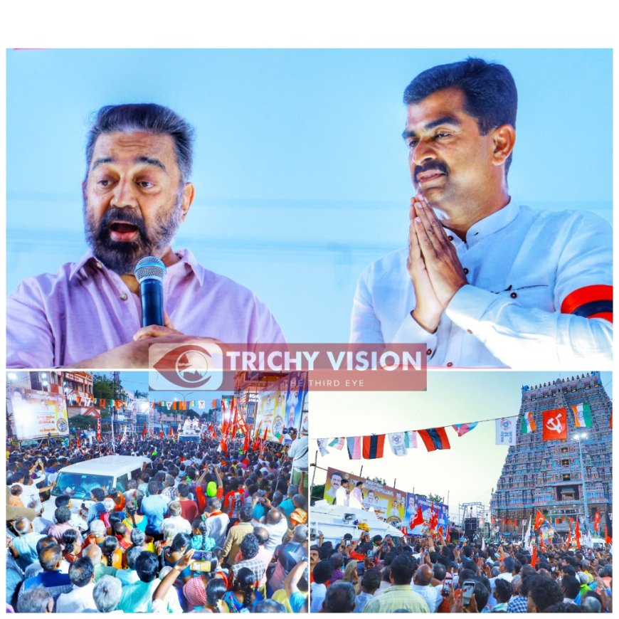 திருச்சி பாராளுமன்ற தொகுதி மதிமுக வேட்பாளர் துரை வைகோவை ஆதரித்து இன்று மக்கள் நீதி மய்யம் தலைவர் கமலஹாசன் திருச்சி ஸ்ரீரங்கம் ராஜகோபுரம் முன்பு ஆதரவு கேட்டு பிரச்சாரத்தில் ஈடுபட்டார். அப்போது அவர் பேசுகையில்…. நான் தற்போது இந்த இடத்திற்கு வந்து நிற்க வேண்டிய அவசியமும் காரணமும் என்னவென்றால் தேசம் தேசபக்தி அரசு என்ன என்பதை வாக்காளர்களாகிய நீங்கள் ஒவ்வொருவரும் புரிந்து கொள்ள வேண்டும் என்பதற்காகத்தான். தேசபக்தி என்பது பன்முகத்தன்மையை பாதுகாக்க வேண்டியது.