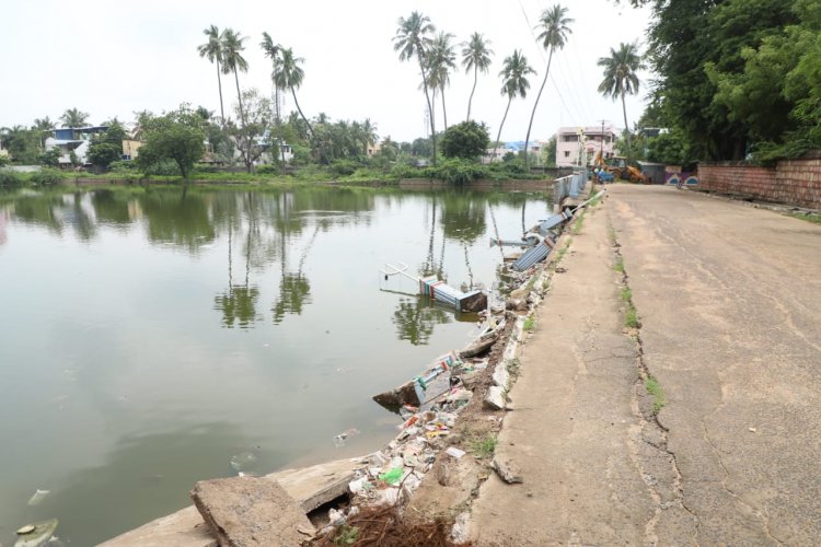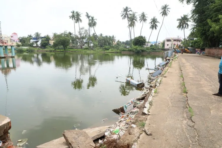 திருவெறும்பூர் மலைக்கோயிலின் தெப்பக்குள சுற்றுச்சுவர் தொடர் மழை காரணமாக இடிந்து குளத்திற்குள் விழுந்தது