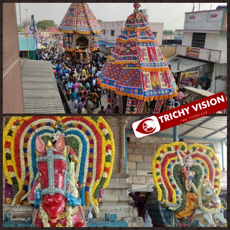 திருச்சி மாவட்டம், மண்ணச்சநல்லூர் அருகே திருப்பட்டூர் ஊராட்சியில் அமைந்துள்ள பிரம்மபுரீஸ்வரர் கோயிலில் பங்குனி தேரோட்டம் வெகு விமரிசையாக நடைபெற்றது.