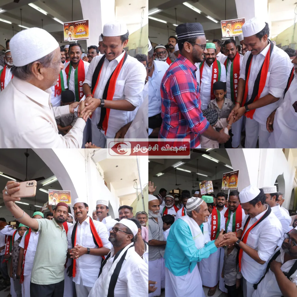 பகுதிகளில் துவக்கி பல்வேறு இடங்களில் வாக்கு சேகரிப்பு ஈடுபட்டார் மேலும் இதன் ஒரு பகுதியாக, திருச்சி மாநகராட்சிக்குட்பட்ட 40-வது வார்டுக்கு உட்பட்ட குத்தாய்ப்பால் ரோட்டில் அமைந்துள்ள மிகவும் பழமை வாய்ந்த முகமதியா பெரிய பள்ளிவாசலில்