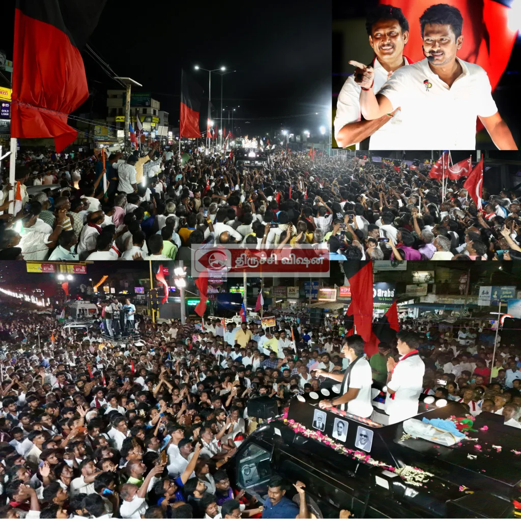 திராவிட முன்னேற்றக் கழகத்தின் இளைஞரணிச் செயலாளரும் தமிழ்நாடு துணை முதலமைச்சருமான உதயநிதி ஸ்டாலின் (10.4.2026) அன்று திருச்சிராப்பள்ளி மாவட்டம் திருவரம்பூர் சட்டமன்ற தொகுதியின் திராவிட முன்னேற்றக் கழக வேட்பாளர் முனைவர் அன்பில் மகேஸ் பொய்யாமொழிக்கு உதயசூரியன் சின்னத்தில் வாக்கு சேகரித்து பிரச்சாரம் மேற்கொண்டார்.