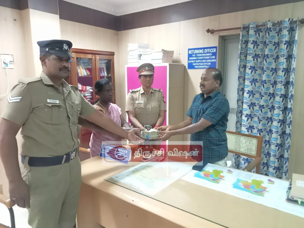 அதற்கு உரிய ஆவணம் இல்லை எனக் கூறி அதனை தேர்தல் பறக்கும்படை அதிகாரி நாகலட்சுமி தலைமையிலான குழுவினர் பறிமுதல் செய்து திருவெறும்பூர் தாசில்தாரும் உதவி தேர்தல் நடத்தும் அலுவலருமான கார்த்திகேயனிடம் ஒப்படைத்தனர்.