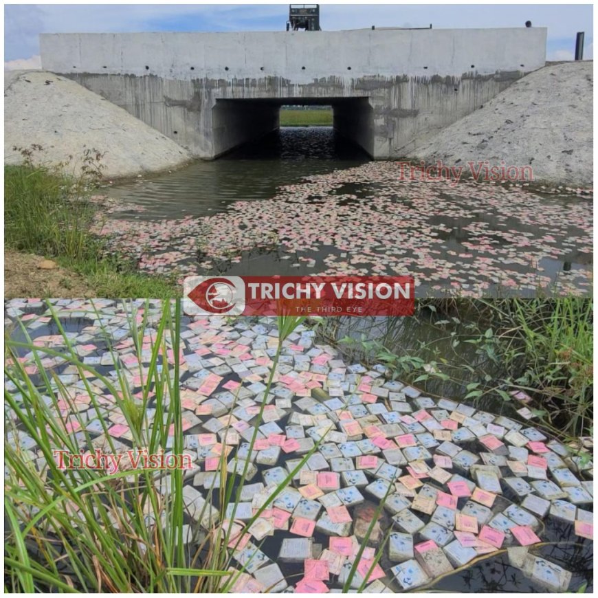 திருச்சி மாவட்டம், சமயபுரம் அருகே மாடக்குடி பேருந்து நிறுத்தம் பகுதியில் விவசாய நிலத்திற்கு செல்லும் வாய்க்கால் உள்ளது. இதில் ஆயிரக்கணக்கான ஆணுறைகள் தண்ணீரில் வீசப்பட்டு மிதக்கின்றன. அந்த ஆணுறைகளில் அரசு முத்திரை பொறிக்கப்பட்டிருப்பதால் அரசு மருத்துவமனைகளில் பொதுமக்களுக்கு இலவசமாக கொடுக்க வழங்கப்பட்டதாக தெரிகிறது. மேலும் வாய்க்காலில் வீசப்பட்டுள்ள ஆணுறைகள் அனைத்தும் காலாவதி ஆகாத ஆணுறைகளாக இருக்கின்றன.