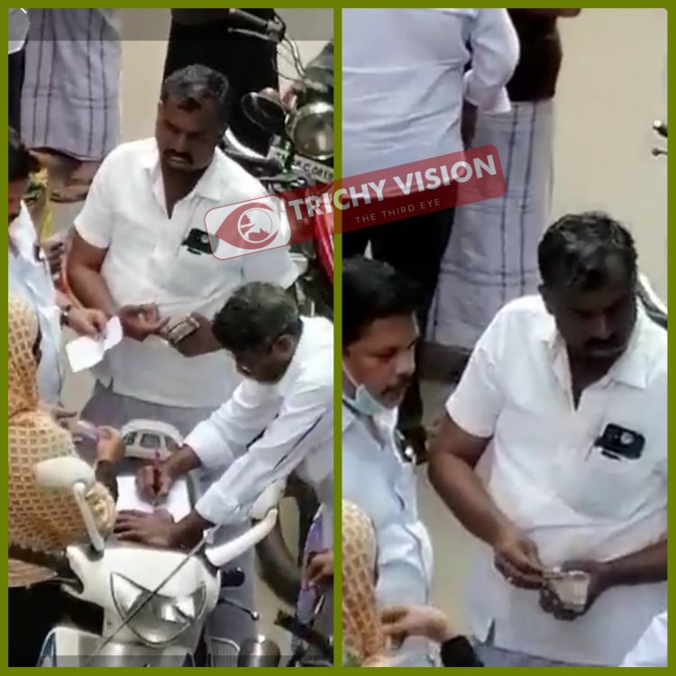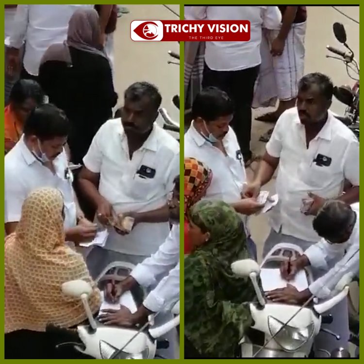 திருச்சி மாநகராட்சி 29வது வார்டில், தி.மு.க., சார்பில் போட்டியிடும் கமால் முஸ்தபாவுக்கு ஓட்டளிக்குமாறு, பண பட்டுவாடா செய்கின்றனர்.