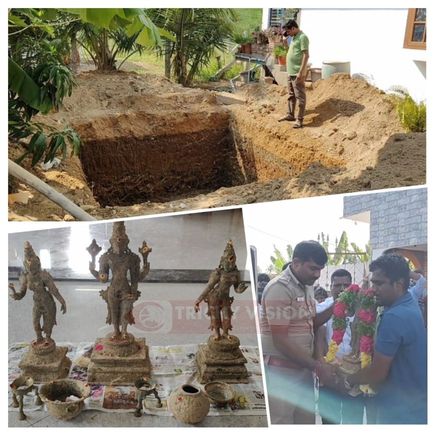 இதில் பூமிக்கு அடியில் இருந்த மீட்கப்பட்ட சிலைகள் ஐம்பொன்னினால் ஆன பெருமாள், ஸ்ரீதேவி மற்றும் பூதேவி தெய்வங்களின் சிலைகள் என்பதும் அதனுடன் மீட்கப்பட்ட பொருட்கள் சாமிக்கு பூஜைகள் செய்ய பயன்படுத்தப்படும் செப்பு பொருட்கள் என்பதும் தெரியவந்தது.