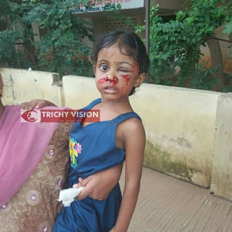 இதனால் குழந்தையின் நெற்றி, மூக்கு, கண்ணம் பகுதியில் ஆழமான காயம் ஏற்பட்டுள்ளது. பின்னர் உடனடியாக சிவன்யா திருச்சி அரசு மருத்துவமனையில் அனுமதிக்கப்பட்டு சிகிச்சை பெற்று வருகின்றார். குழந்தையை வெறி பிடித்த தெரு நாய் கடித்த சம்பவத்தால் அப்பகுதி மக்கள் அச்சத்தில் உள்ளனர்.
