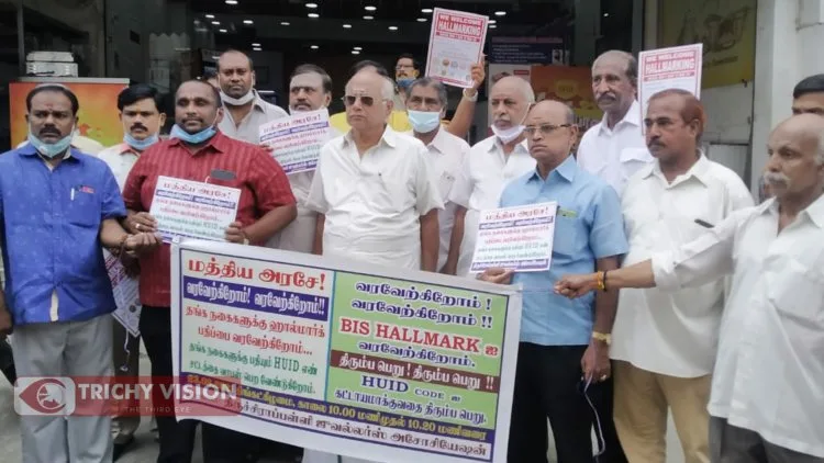 மத்திய அரசின் தங்க நகை சட்டத்தை (HUID) வேண்டாம் என வலியுறுத்தி திருச்சியில் உள்ள நகை கடைகளை மூன்று மணி நேரம் அடைத்து போராட்டம் நடத்தினர்.