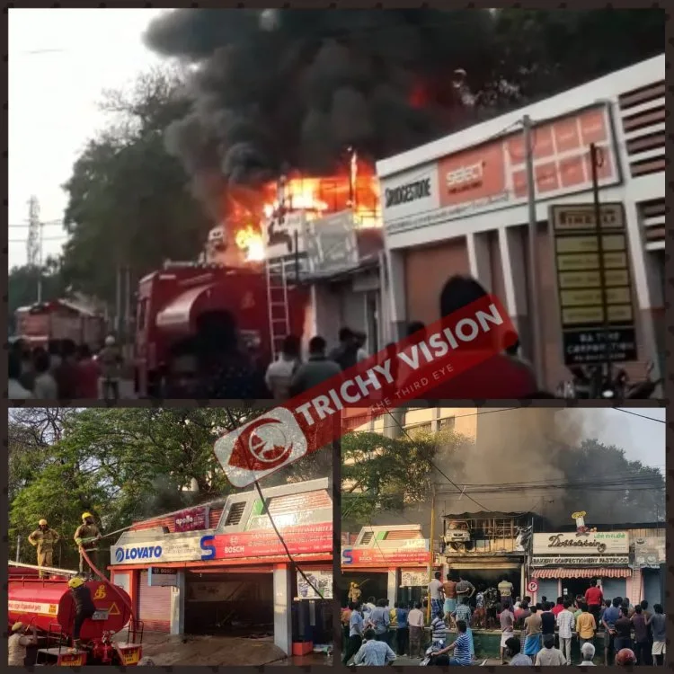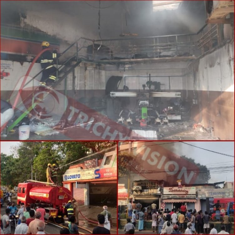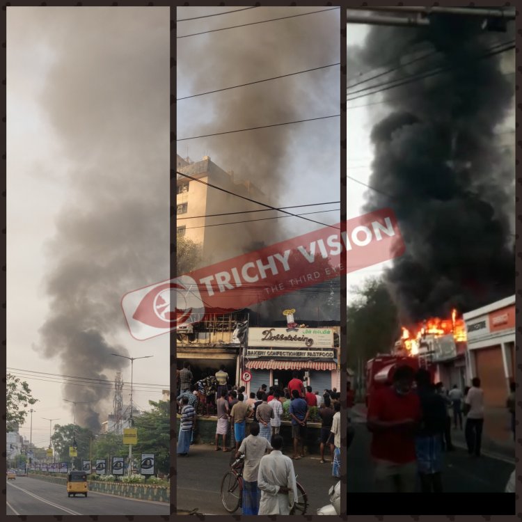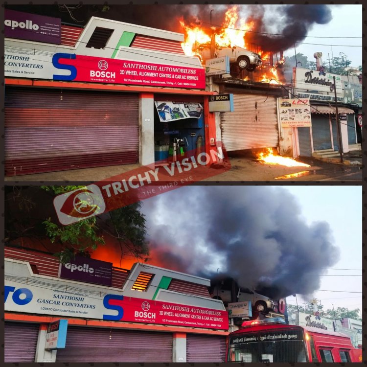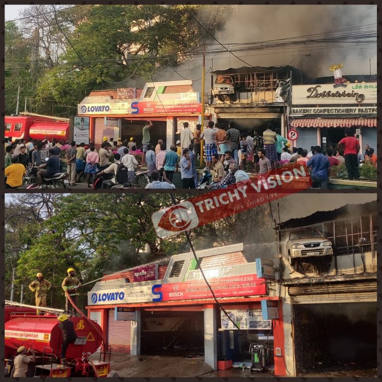விரைந்து வந்த திருச்சி கண்டோன்மென்ட் தீயணைப்பு வீரர்கள் தீயை அணைக்கும் பணியில் ஈடுபட்டனர். இதனிடையே தீ மளமளவென பரவி அருகே உள்ள சந்தோஷி Car Care மற்றும் டபுள் ஸ்டைன் என்ற பேக்கரி ஆகிய இரு கடைக்கும் பரவியது. இதனால் இந்த மூன்று கடைகளிலும் ஏற்பட்டுள்ள