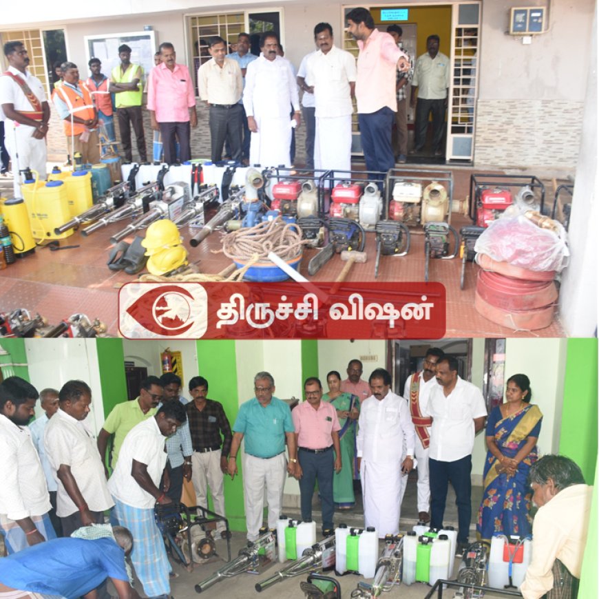 திருச்சிராப்பள்ளி மாநகராட்சி பகுதியில் வடகிழக்கு பருவமழை எதிர்கொள்ள முன்னெச்சரிக்கை நடவடிக்கை எடுப்பது தொடர்பாக 5வது, மண்டலம் தயார் நிலையில் வைக்கப்பட்டுள்ள மின்மோட்டார்கள், ஆயில் இன்ஜினீகள், மரம் அறுக்கும் இயந்திரம் மற்றும் சுகாதார பணிகளுக்கு புகை மருந்து அடிக்கும் இயந்திரம் ஆகியவை தயார் நிலையில் இருப்பதை மேயர் மு. அன்பழகன் மண்டல குழு தலைவர் மற்றும் அலுவலர்களுடன் பார்வையிட்டார்.
