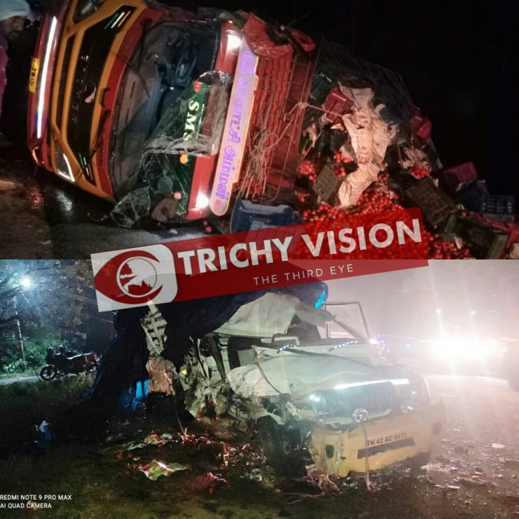 திருச்சி அருகே தக்காளி – ஆப்பிள் வேன் நேருக்கு நேர் மோதி விபத்து ஒருவர் பலி