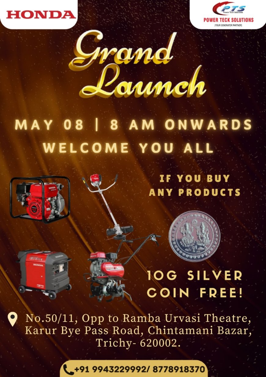 HONDA-வின் புதிய தயாரிப்புகளின் அறிமுகம் விழா நாளை (08.05.2024) புதன்கிழமை திருச்சி – கரூர் நெடுஞ்சாலையில் சிந்தாமணி அருகே உள்ள ரம்பா ஊர்வசி திரையரங்கு எதிர்புறம் நடைபெற உள்ளது.