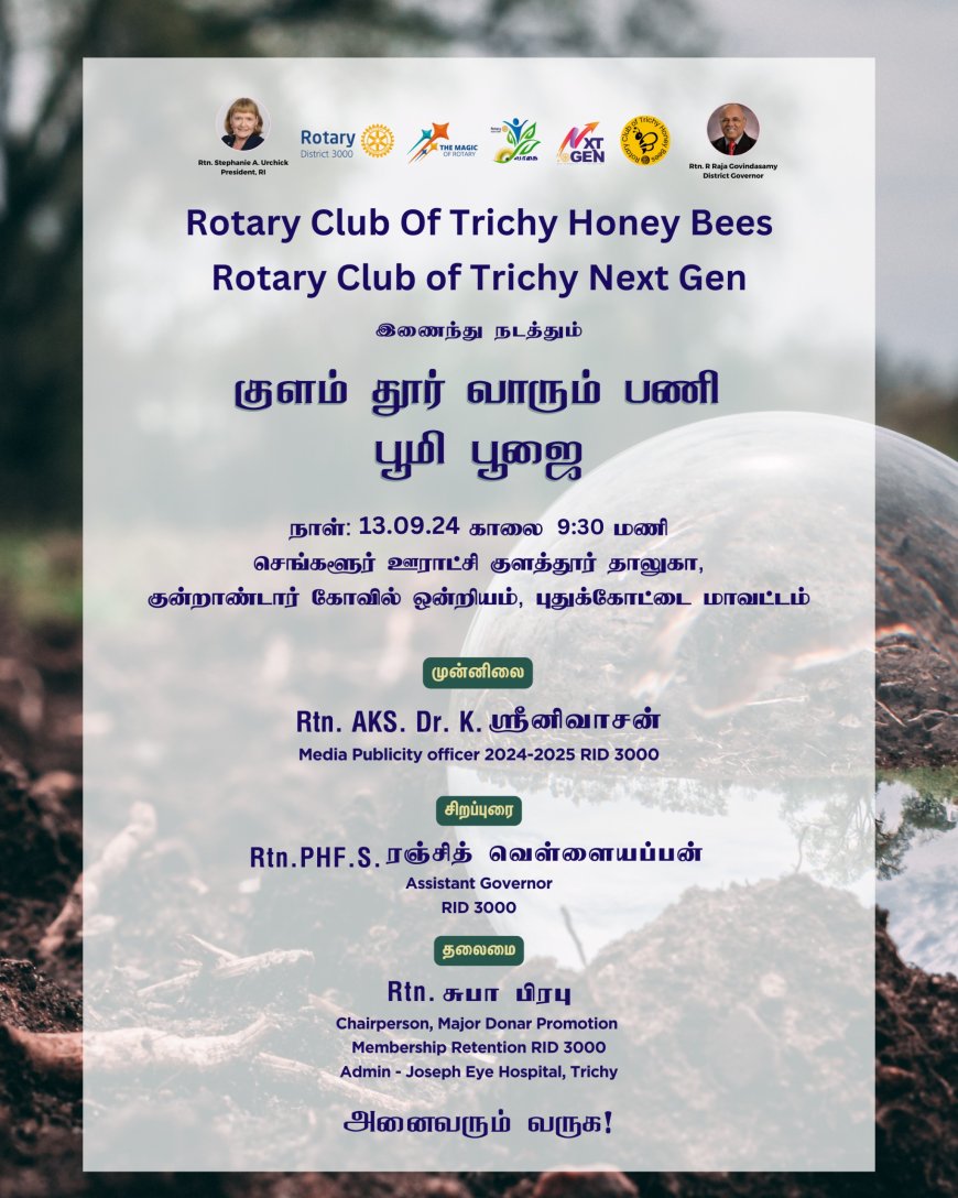 Rotary Club Of Trichy Honey Bees, Rotary Club of Trichy Next Gen இணைந்து நடத்தும் குளம் தூர் வாரும் பணி பூமி பூஜை நாள் : (13.09.24) காலை 9:30 மணி செங்களூர் ஊராட்சி குளத்தூர் தாலுகா, குன்றாண்டார் கோவில் ஒன்றியம், புதுக்கோட்டை மாவட்டம்
