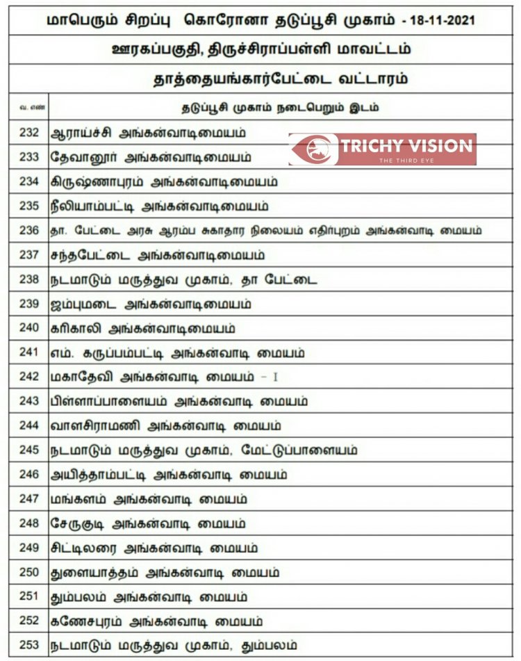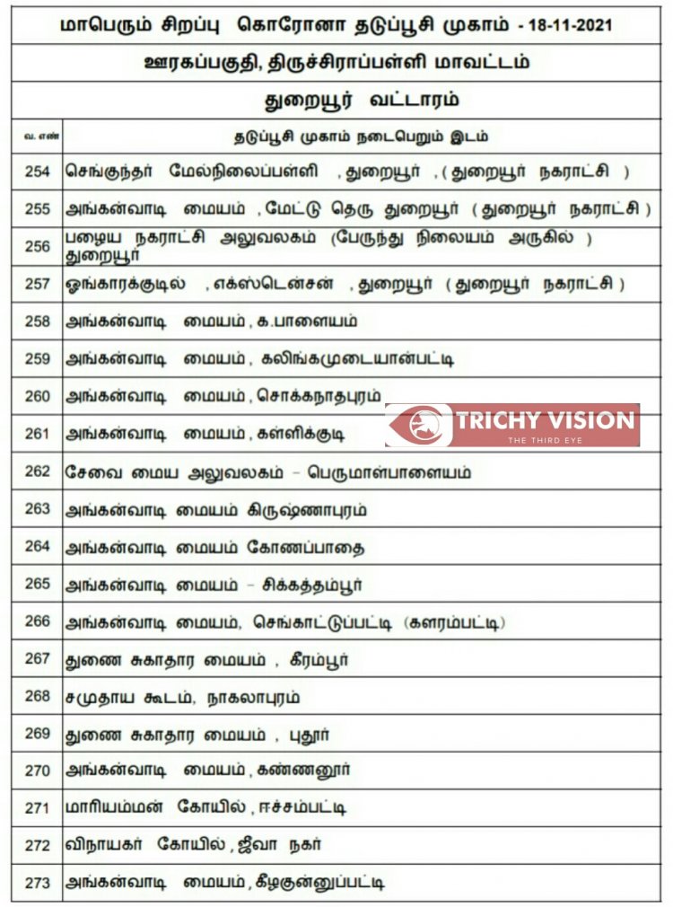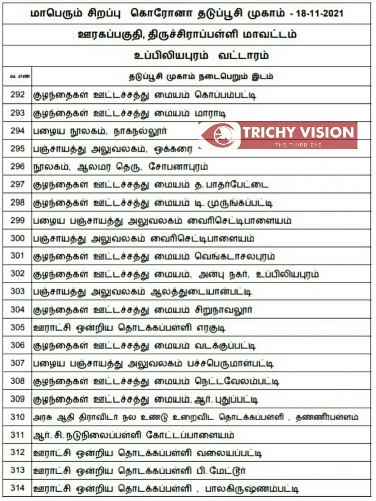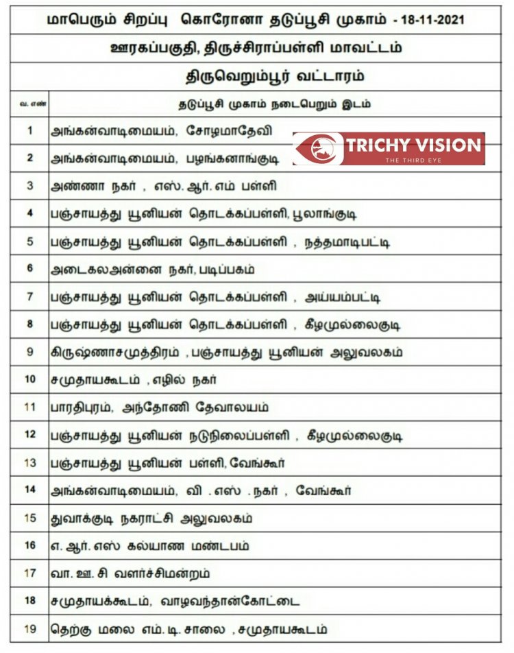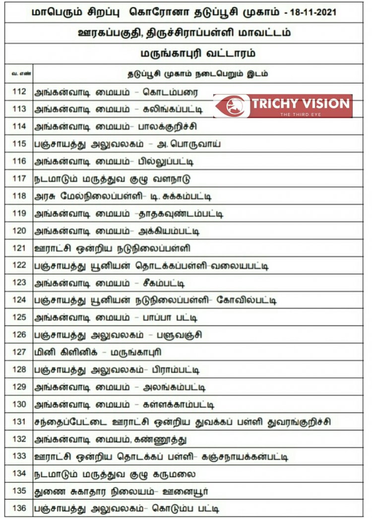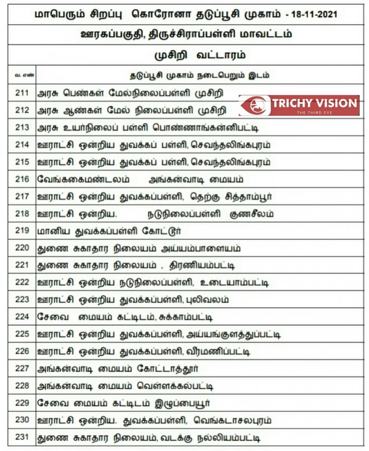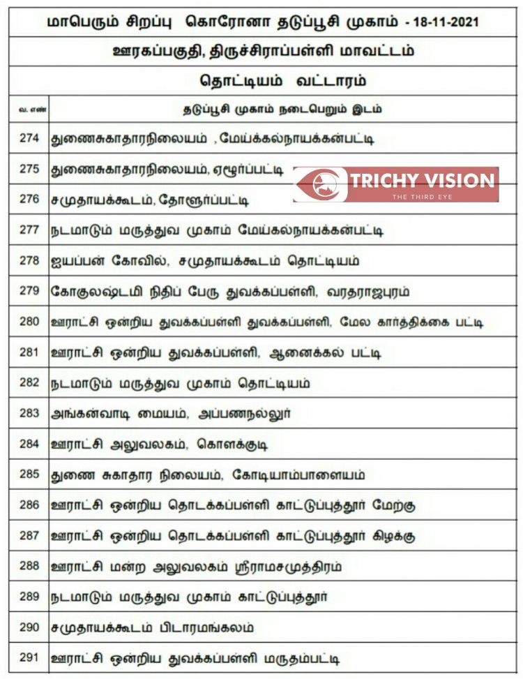 திருச்சி மாவட்டத்தில் 14 ஒன்றியங்களில் 314 இடங்களில் நாளை (18.11.2021) கோவிசீல்டு, கோவாக்சின் தடுப்பு ஊசிகள் போடப்படும் இடங்களை மாவட்ட நிர்வாகம் அறிவித்துள்ளது.