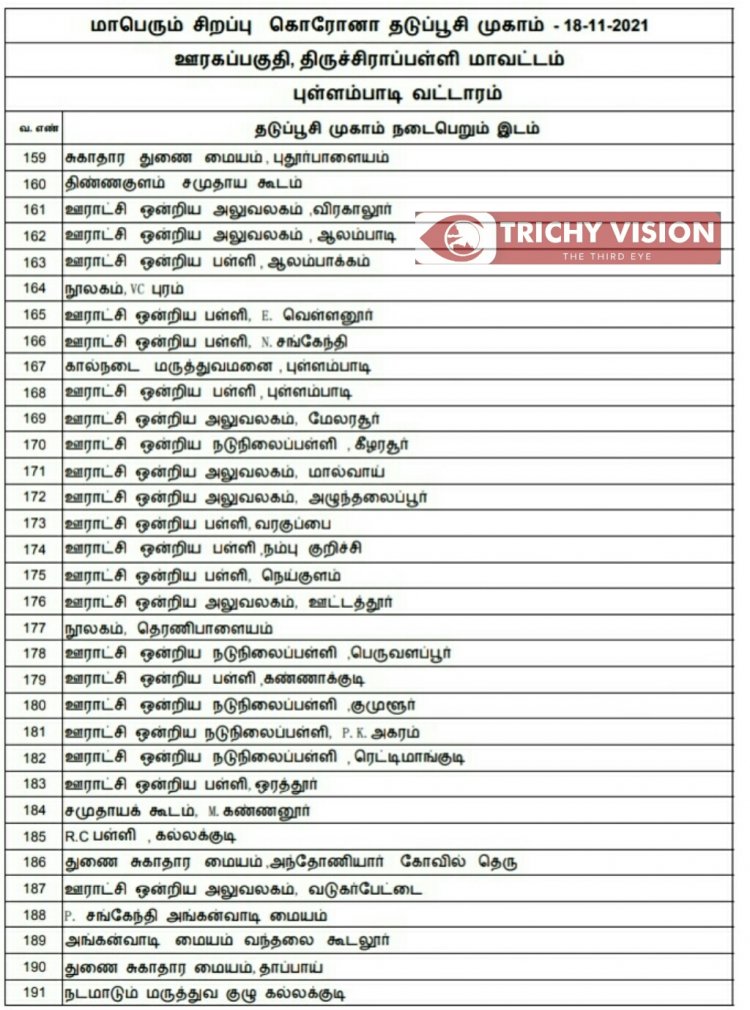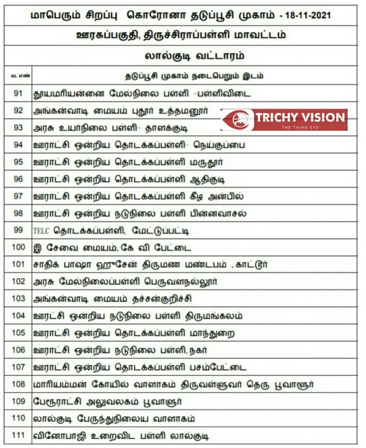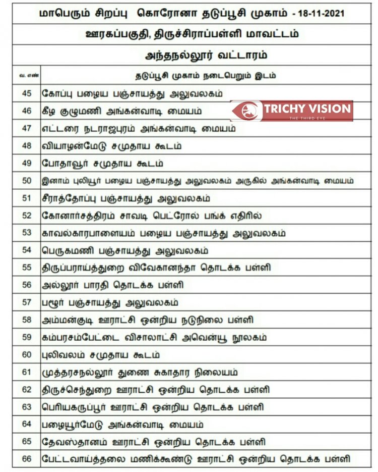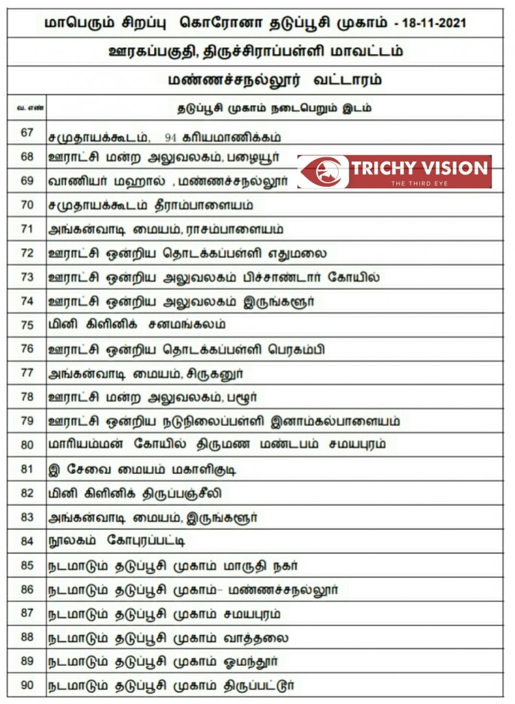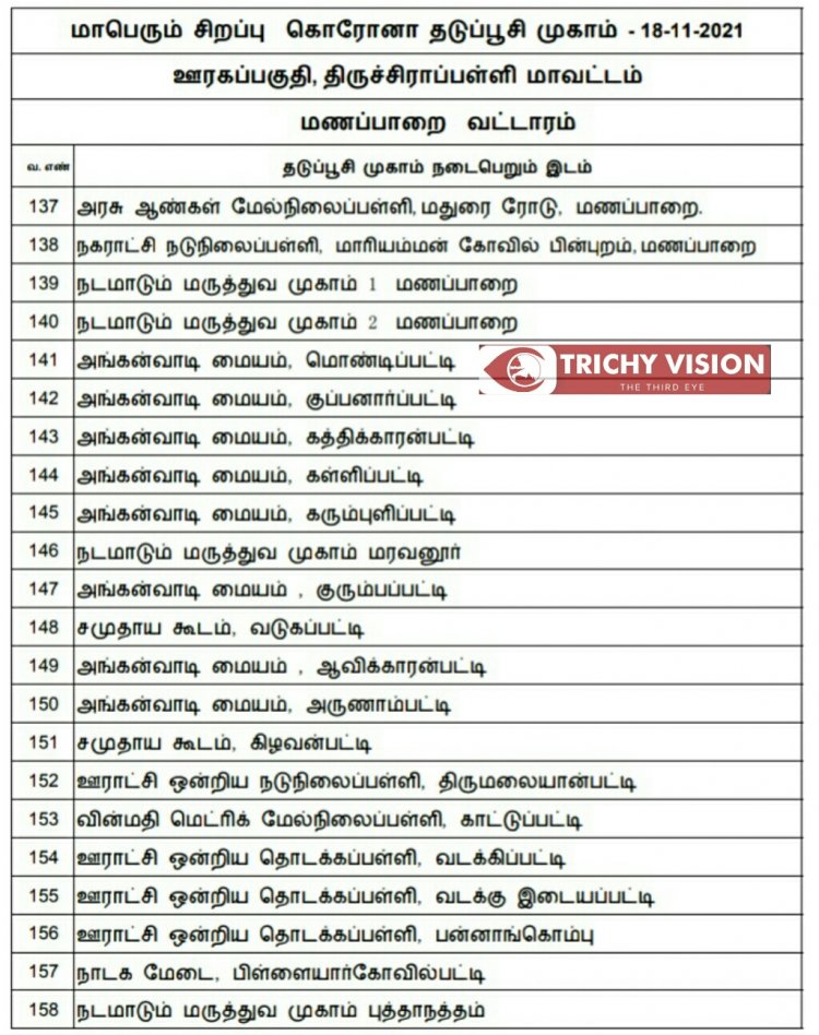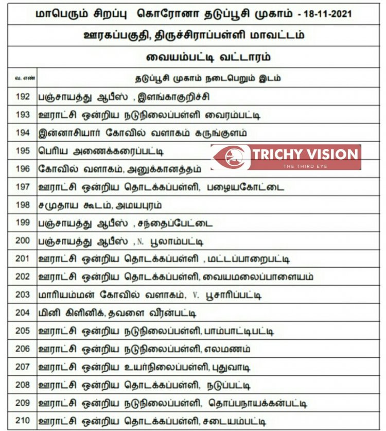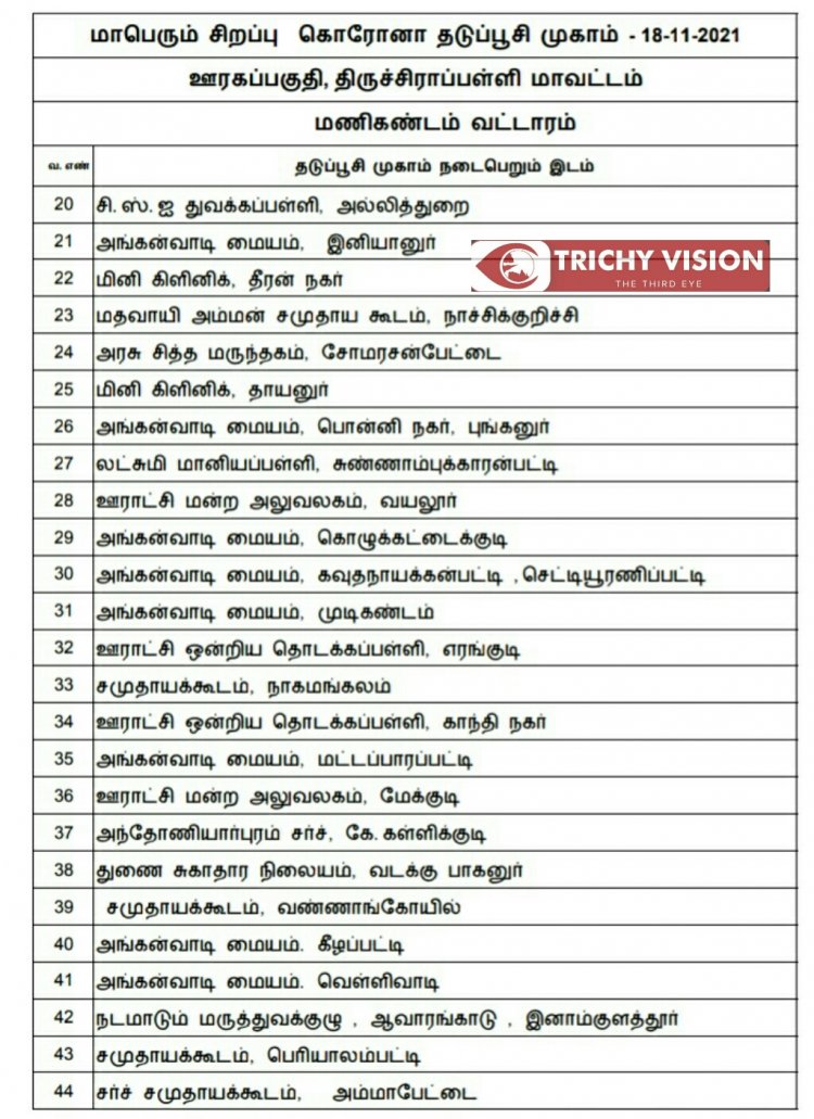 திருச்சி மாவட்டத்தில் 14 ஒன்றியங்களில் 314 இடங்களில் நாளை (18.11.2021) கோவிசீல்டு, கோவாக்சின் தடுப்பு ஊசிகள் போடப்படும் இடங்களை மாவட்ட நிர்வாகம் அறிவித்துள்ளது.