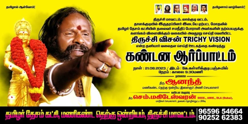 தமிழர் தேசம் கட்சியின் தலைவர் சமநீதிப் போராளி அவர்களின் நற்பெயருக்கு களங்கம் விளைவிக்கும் வகையில் அவதூறு செய்தி வெளியிட்ட திருச்சி விசன் TRICHY VISION என்ற தனியார் வலைதள செய்தி ஊடகத்தை கண்டித்து கண்டன ஆர்ப்பாட்டம் என்று தகவல் வெளியிடப்பட்டுள்ளது.