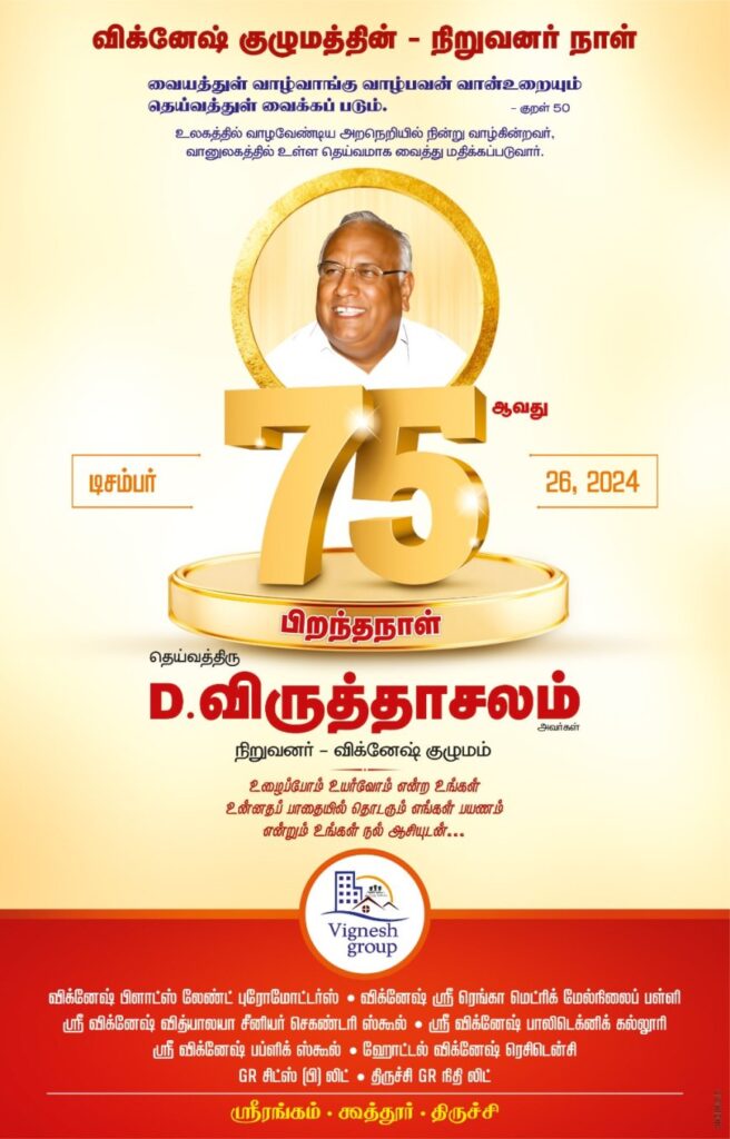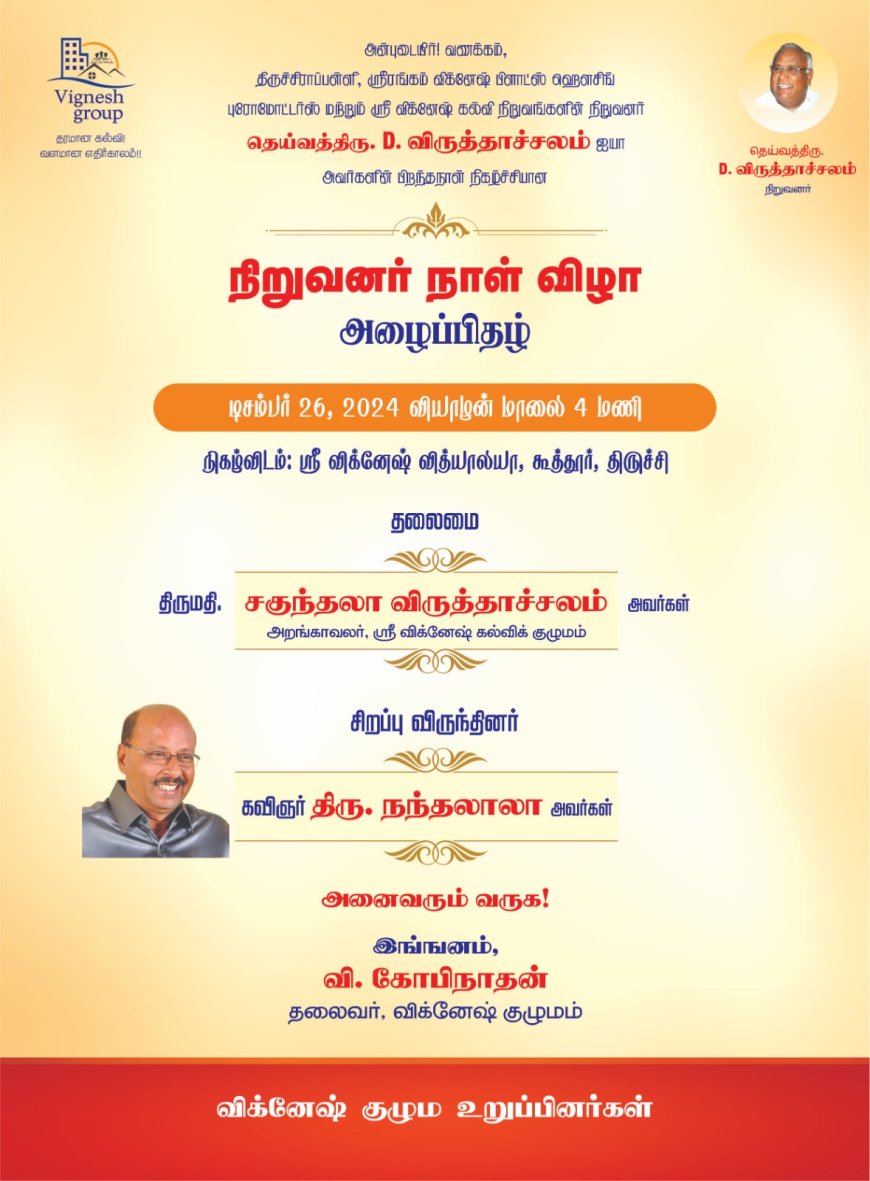 திருச்சிராப்பள்ளி, ஸ்ரீரங்கம் விக்ளேஷ் பிளாட்ஸ் ஹௌசிங் புரோமோட்டர்ஸ் மற்றும் ஸ்ரீ விக்னேஷ் கல்வி நிறுவங்களின் நிறுவனர் தெய்வத்திரு.D. விருத்தாச்சலம் அவர்களின் பிறந்தநாள் நிகழ்ச்சியான நிறுவனர் நாள் விழா டிசம்பர் 26, 2024 வியாழன் மாலை 4 மணி அளவில் ஸ்ரீ விக்னேஷ் வித்யாலியா, கூத்தூர், திருச்சி நடைபெற உள்ளது.
