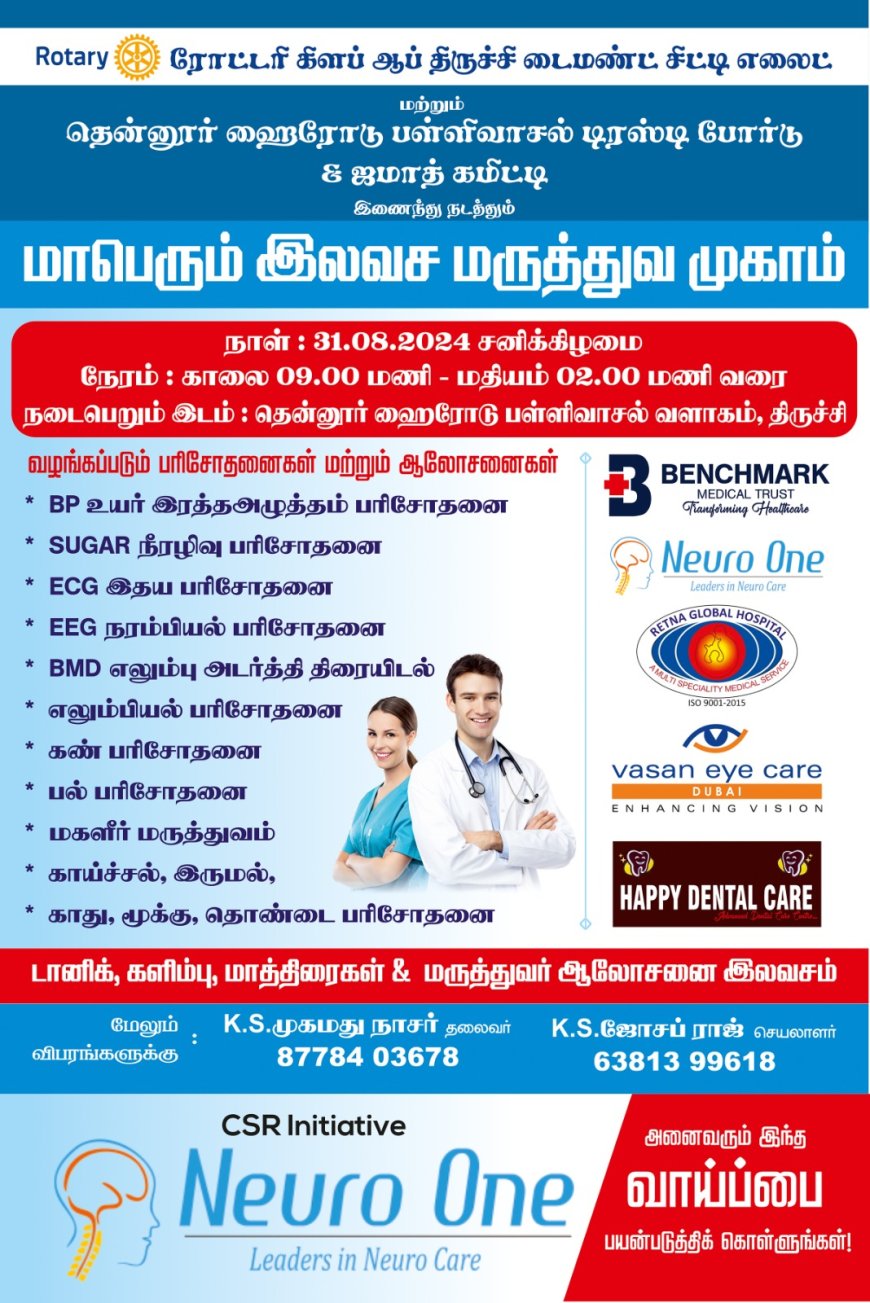 ரோட்டரி கிளப் ஆப் திருச்சி டைமண்ட் சிட்டி எலைட் மற்றும் தென்னூர் ஹைரோடு பள்ளிவாசல் டிரஸ்டி போர்டு & ஜமாத் கமிட்டி இணைந்து நடத்தும் மாபெரும் இலவச மருத்துவ முகாம் நாளை (31.08.2024) சனிக்கிழமை தென்னூர் ஹைரோடு பள்ளிவாசல் வளாகத்தில் காலை 09:00 மணி முதல் மதியம் 02:00 மணி வரை நடைபெறுகிறது.
