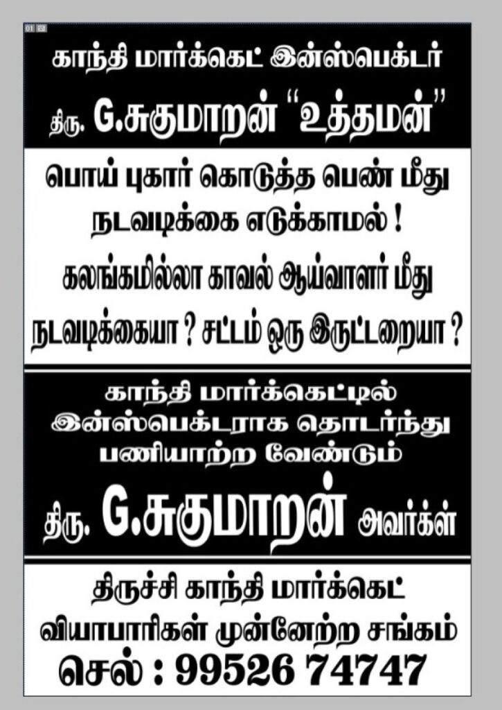 காவல் ஆய்வாளர் மீதான பாலியல் குற்றச்சாட்டு தற்போது பெரும் பரபரப்பை ஏற்படுத்தி உள்ள நிலையில் இந்த குற்றச்சாட்டு குறித்து தற்பொழுது தீவிர விசாரணை நடைபெற்று வருகிறது இது ஒரு புறமிருக்க காவல் ஆய்வாளர் மீதான குற்றச்சாட்டை கண்டித்தும் அவருக்கு ஆதரவாக காந்தி மார்க்கெட் வியாபாரிகள் சமூக வலைதளங்களில் பதிவிட்டு வருகின்றனர் மேலும் காவல் ஆய்வாளர் மீது பொய்யான புகார் அளித்த அந்த பெண் மீது நடவடிக்கை எடுக்க கோரியும், காவல் ஆய்வாளரின் செயல்பாடுகள் குறித்தும் சமூக வலைதளங்களில் போஸ்டர்கள் வைரலாகி வருகின்றன.