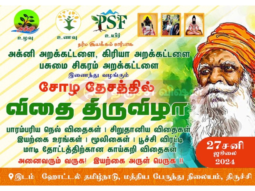 மாடி தோட்டம் அமைக்க விரும்பும் பொதுமக்கள் பயன் பெரும் வகையில் பாரம்பரிய விதை திருவிழா நிகழ்ச்சியை திட்டமிட்டுள்ளார்கள் . நிகழ்ச்சியானது வருகின்ற (27.07.2024) (சனிக்கிழமை) திருச்சி மத்திய பேருந்து நிலையம் அருகில் ‘தமிழ்நாடு ஹோட்டல் காவேரி அரங்கில் காலை 8:00 முதல் இரவு 8:00 மணி வரை நடைபெற உள்ளது.