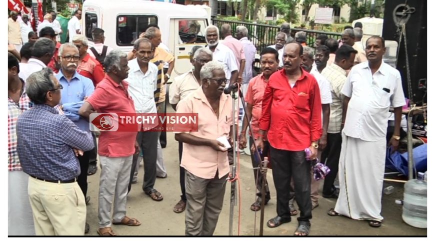 2023க்கு பிறகு பணியில் சேர்ந்தவர்களுக்கு பழைய பென்ஷன் திட்டத்தை அமல்படுத்த வேண்டும், காலி பணியிடங்களை 100% பூர்த்தி செய்ய வேண்டும் உள்ளிட்ட கோரிக்கைகளை வலியுறுத்தி திருச்சியில் CITU, AITUC, TTSF, INTUC, HMS, AALLF, MLF, DWU மற்றும் ஓய்வூதியர் நல சங்கங்களின் கூட்டமைப்பு சார்பில் திருச்சியில் தொடர் முழக்கப் போராட்டம் இன்று நடைபெற்றது. திருச்சி மாவட்ட ஆட்சியர் அலுவலகம் எதிரே உள்ள தமிழ்நாடு போக்குவரத்து கழகம் கும்பகோணம் லிமிட் மண்டல தலைமை அலுவலகம்