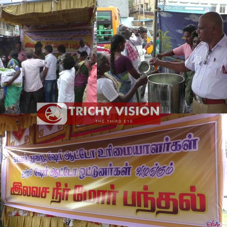 இதன் ஒருபகுதியாக திருச்சி மத்திய பேருந்து நிலையம் பகுதியில் போக்குவரத்து காவல்துறையினர் மற்றும் ஷேர் ஆட்டோ உரிமையாளர்கள், ஓட்டுநர்கள் சார்பில் நீர் மோர் பந்தல் அமைக்கப்பட்டுள்ளது. எப்பொழுதும் பரபரப்பாக காட்சி அளிக்கக் கூடிய பேருந்து நிலையத்தில் ஆயிரக்கணக்கான மக்கள் வந்து செல்கின்றனர். தற்போது கோடை வெப்பம் அதிகரித்து உள்ள நிலையில் பொதுமக்களுக்கும் பேருந்து பயணிகளுக்கும் கோடை வெப்பத்திலிருந்து தவிர்த்த மோர் மற்றும் குளிர்பானம் வழங்கப்படுகிறது.