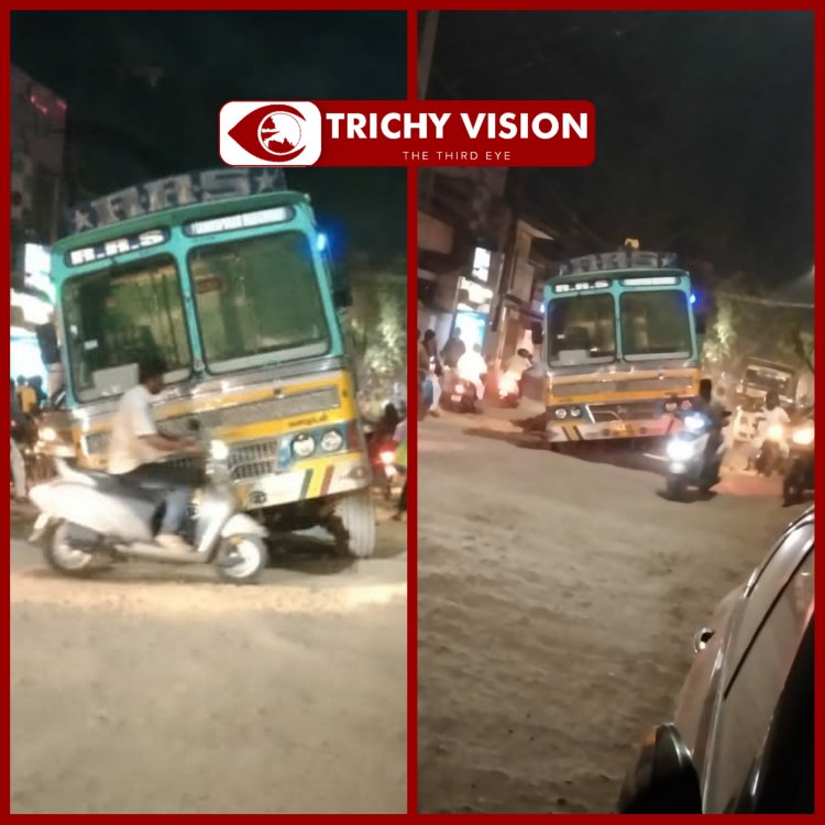 திருச்சி,தென்னூர் அரசமரத்தடி பேருந்து நிறுத்தத்தில் சற்று நேரத்திற்க்கு முன்பாக சிவன் கோவில் அருகே லாரி ஒன்று பெரும் பள்ளத்தில் மாட்டிக் கொண்டு சிறிது சாய்ந்த நிலையில் சாலையின் நடுவே நின்றது.
