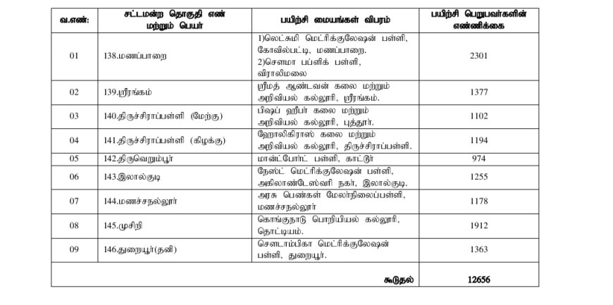 இந்திய தேர்தல் ஆணைய உத்தரவின்படி, பாராளுமன்ற தேர்தல், 2024 ஐ முன்னிட்டு, வாக்குச்சாவடிகளில் பணியாற்றவுள்ள வாக்குச்சாவடி தலைமை அலுவலர்கள் மற்றும் வாக்குப்பதிவு அலுவலர்களுக்கான தேர்வு குலுக்கள் முறையில் (Randomization) மாவட்ட தேர்தல் அலுவலர் / மாவட்ட ஆட்சித்தலைவர் மா.பிரதிப் குமார் முன்னிலையில் 21.03.2024 அன்று தேர்வு செய்யப்பட்டு, அவர்களுக்கு கீழ்கண்டுள்ள விபரப்படி சட்டமன்ற தொகுதிவாரியாக பயிற்சி மையங்கள் அமைக்கப்பட்டு, 24.03.2024 இன்று அனைந்து சட்டமன்ற தொகுதிகளில் வாக்குச்சாவடி அலுவலர்களுக்கான பயிற்சி நடைபெற்றது.
